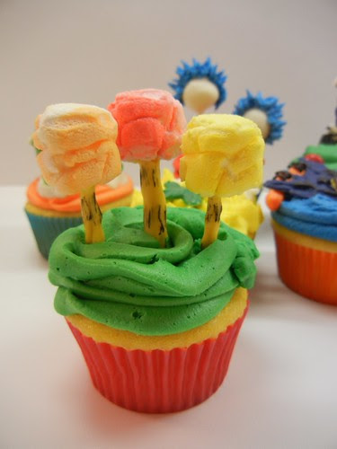 Dr. Seuss cupcakes by Sugar Swings! Serves Some: Green Eggs and Ham, Lorax Truffula Trees and Thing 1 and Thing 2